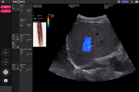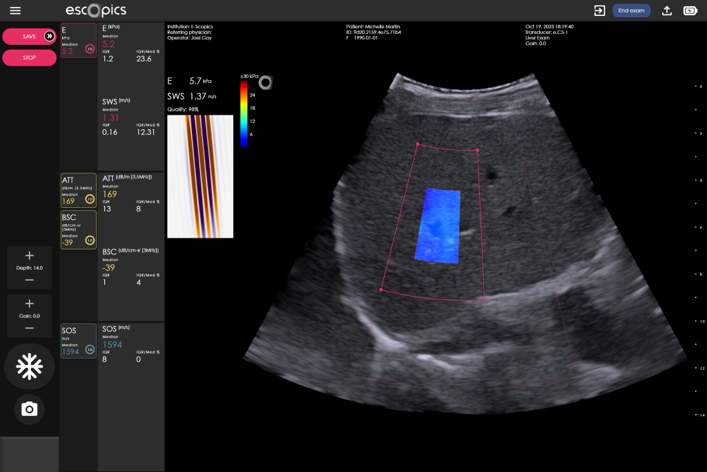 The advanced features of the Hepatoscope enable broad liver disease assessment across care settings: ultraportability, 50 Hz mechanical transient elastography, ultrafast imaging (real-time stiffness imaging), B-mode image.